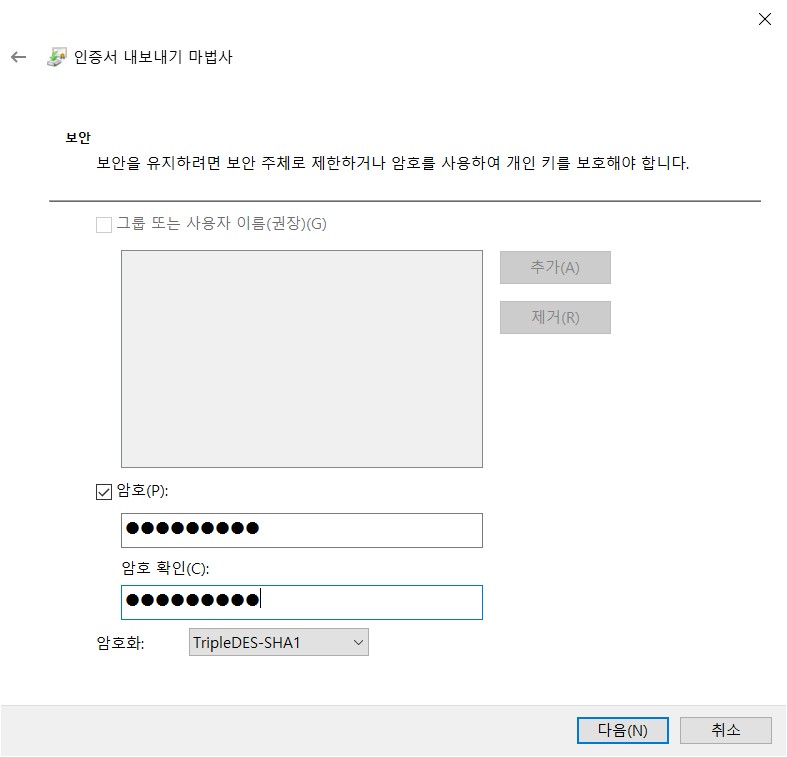 - [암호]에 체크 후, 암호를 입력 후 [다음] 클릭