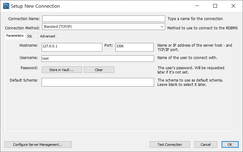 - hostname엔 도커가 실행되는 서버의 IP를 입력한다. (workbench와 같은 컴퓨터에서 실행되면 127.0.0.1로 그냥 두고, 다른 서버에서 실행중이라면 다른 서버의 공인 IP를 입력)
